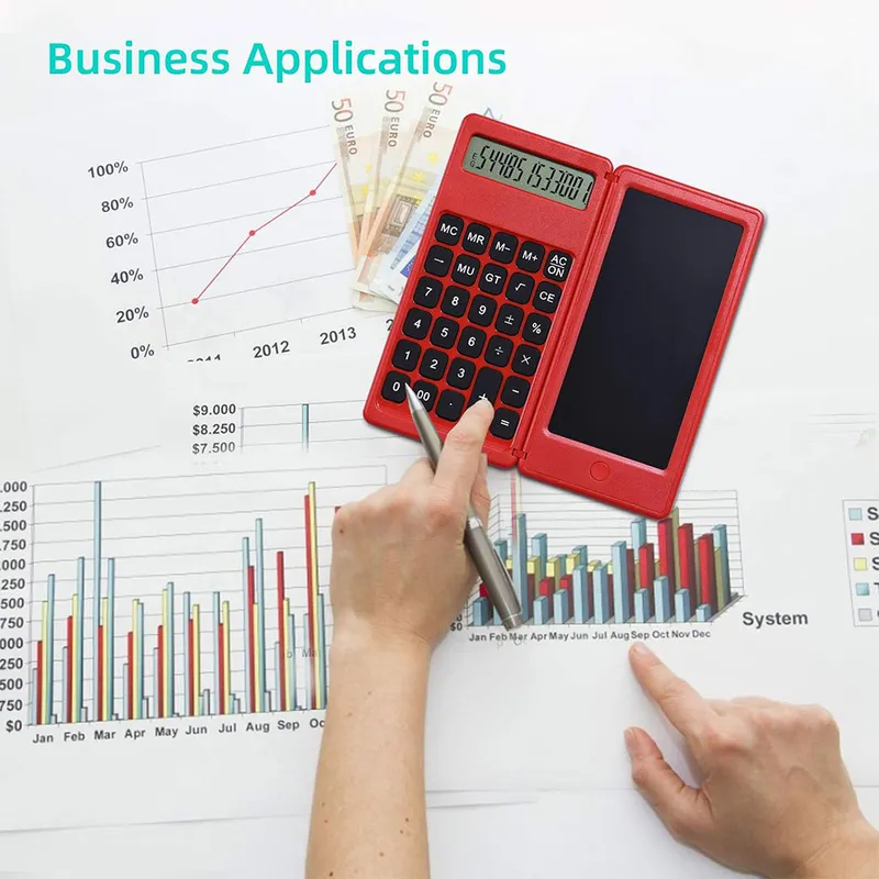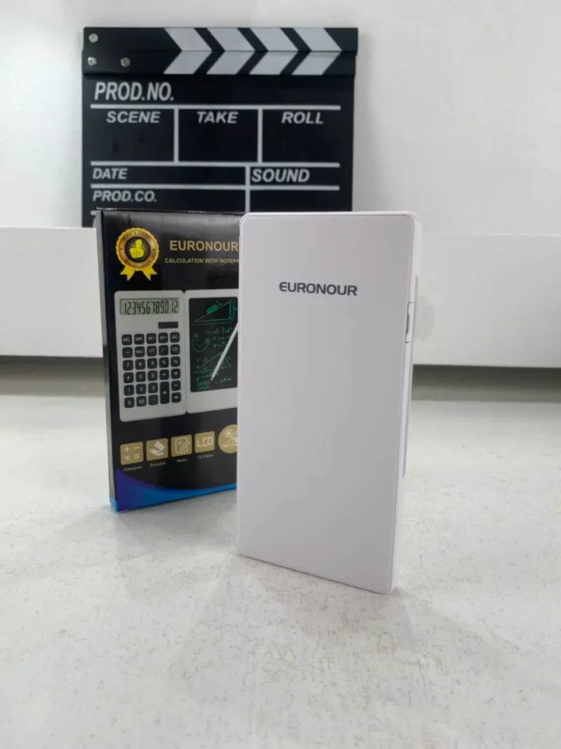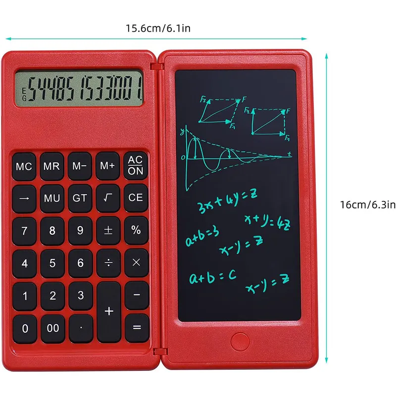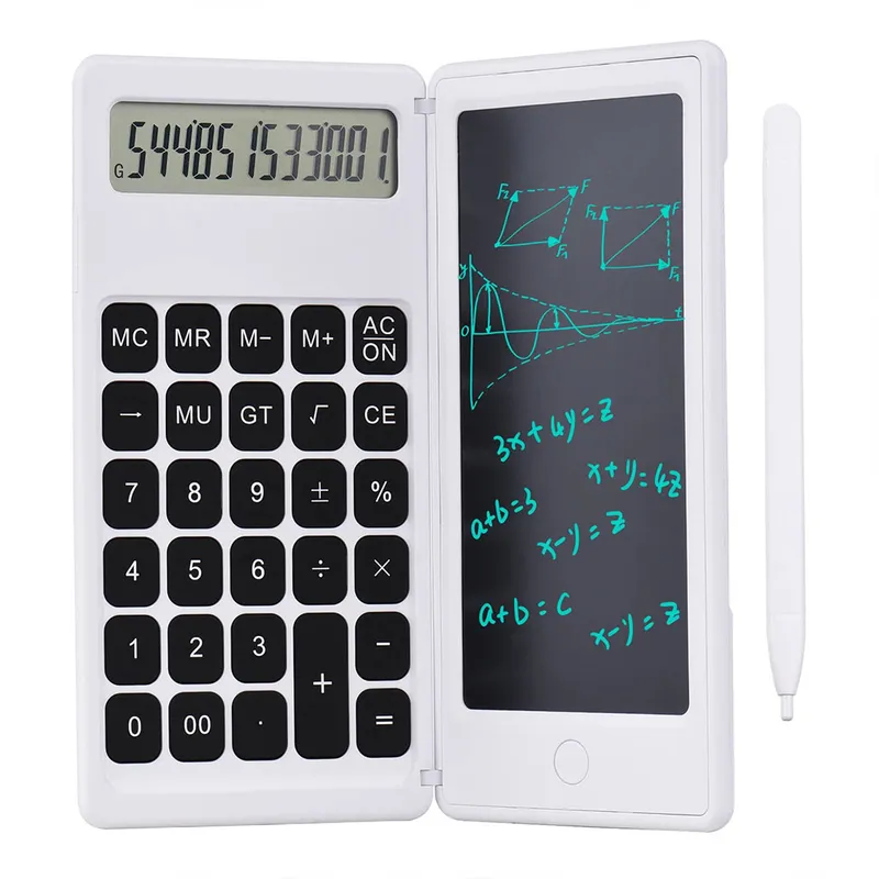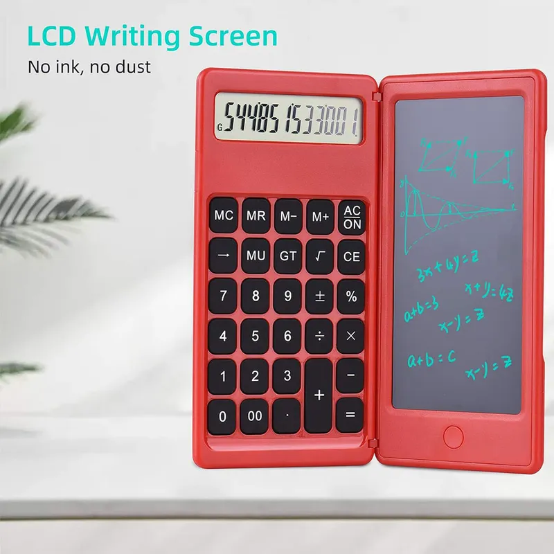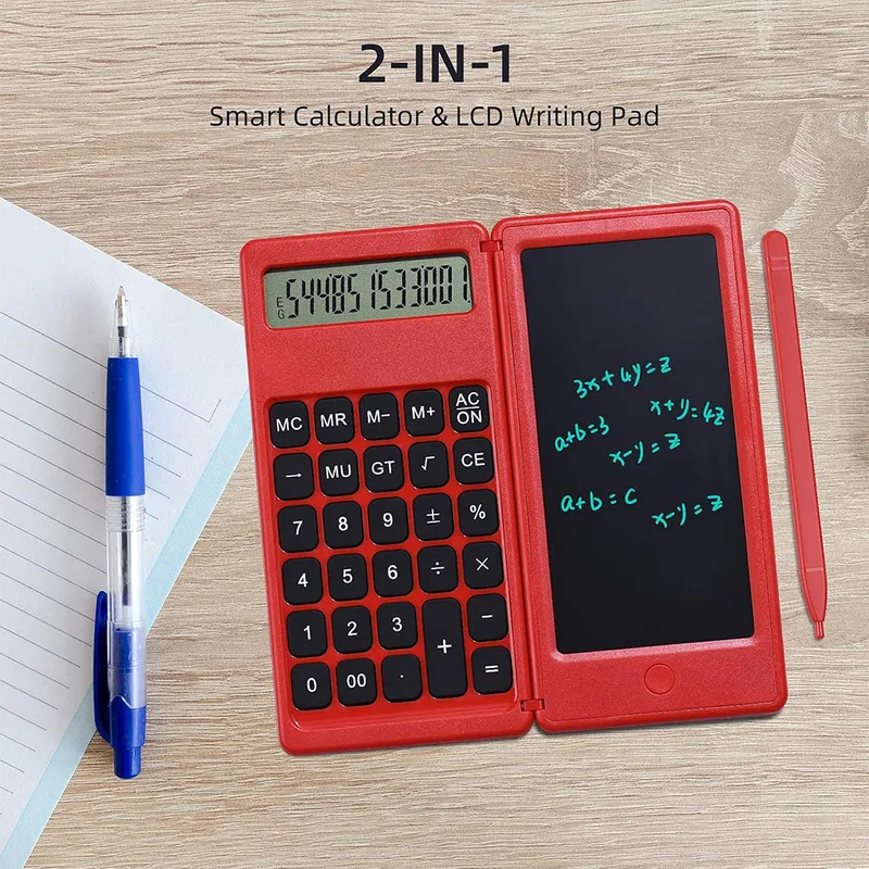 نصف الجهاز آلة حاسبة بـ 12 رقم تلبي كل احتياجاتك في الحساب اليومي، والنصف الآخر لوح كتابة LCD بدون إشعاع ضار للعينين (مافيهاش الضوء الأزرق). تقدر تمسح وتعاود تكتب بسهولة بزر واحد فقط — هكذا تنقص من استهلاك الورق وتحافظ على البيئة.